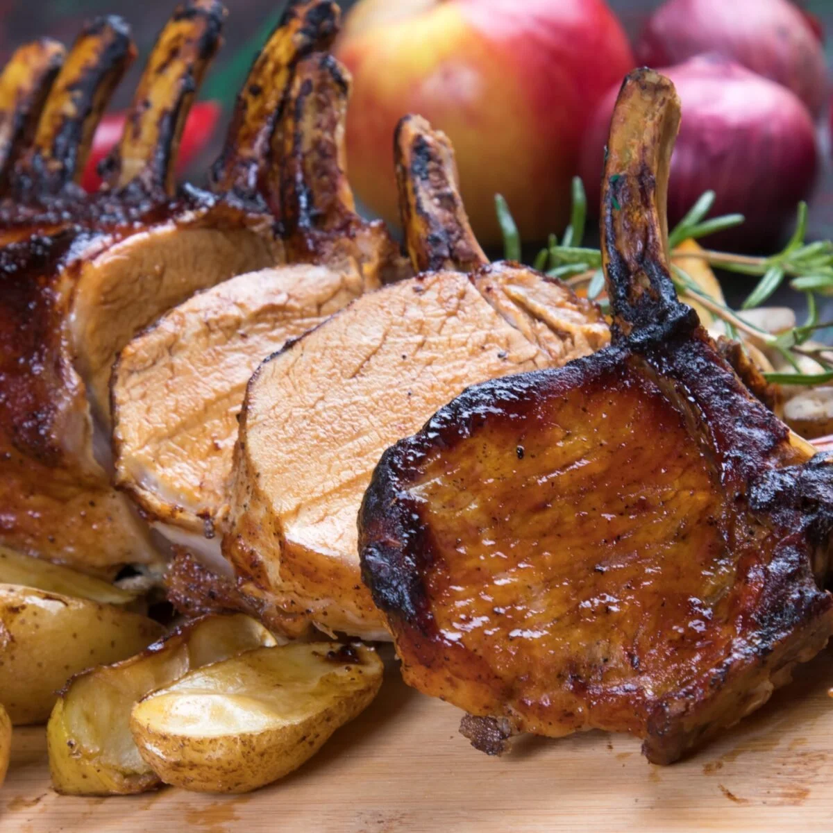 1 bone-in pork loin (6–8 chops), fat on and have butcher crack the bones for easy cutting